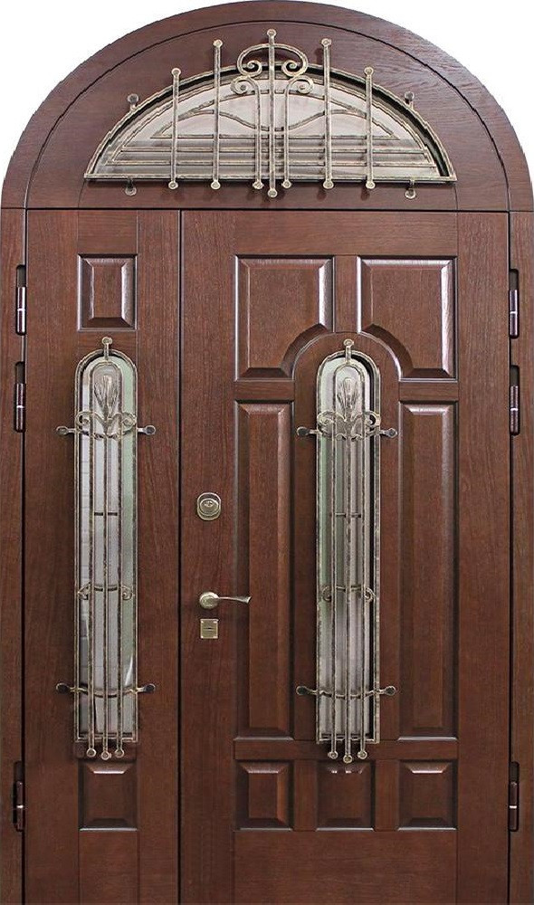Арочные конструкции всегда придают входу выразительность и особый статус, а если добавить две створки и стеклянные вставки, дверь превращается в центральный элемент фасада. Натуральное дерево в отделке подчеркивает солидность и гармонично сочетается с металлом, из которого выполнено основание: каркас и полотно из профильных труб и стальной лист толщиной 2 мм обеспечивают прочность и долговечность. Для удобства и безопасности используются два замка разного типа — сувальдный и цилиндровый, оба с тремя ригелями, что делает взлом крайне затруднительным. Двухстворчатая арочная дверь со стеклом в частный дом №14 может изготавливаться любого размера и адаптироваться под архитектуру конкретного здания. Возможна установка дополнительных элементов: зеркало, стеклопакет, кованые детали или даже видеодомофон. Резиновое уплотнение по двум контурам защищает от сквозняков, а возможность выбора отделки и фурнитуры открывает простор для индивидуального дизайна. Двухстворчатая арочная дверь со стеклом в частный дом №14 от производителя: быстрое изготовление и монтаж в Туле, индивидуальные размеры, широкий выбор материалов и фурнитуры, официальная гарантия до 10 лет.