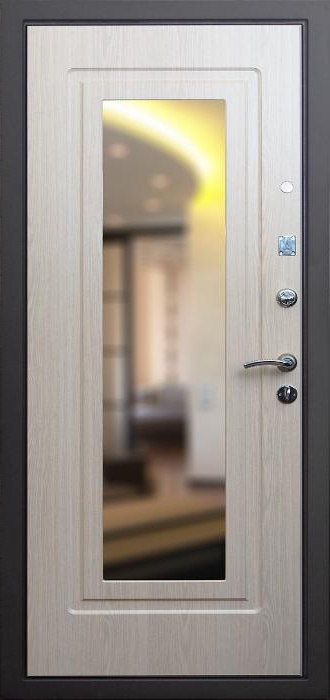 Эта модель создана для тех, кто ценит не только прочность, но и практичность в повседневном использовании. Стальной каркас из профильной трубы и лист металла толщиной 2 мм с рёбрами жёсткости формируют надёжную основу, способную выдерживать серьёзные нагрузки. Снаружи дверь защищена порошковым покрытием, которое устойчиво к влаге, солнцу и механическим повреждениям, а изнутри отделана МДФ-накладкой, придающей интерьеру уют и аккуратность. В центре конструкции внимание привлекает зеркало — удобная деталь, которая избавляет от необходимости в дополнительном настенном аксессуаре и одновременно делает пространство визуально просторнее. Именно здесь название модели — металлическая дверь с зеркалом в дом №2 — обретает своё значение, сочетая функциональность с эстетикой. Для повышения безопасности предусмотрены два замка российского производства с независимыми системами запирания, а также блокираторы. Два контура уплотнителя защищают от сквозняков и пыли, а возможность выбрать направление открывания делает установку универсальной. Металлическая дверь с зеркалом в дом №2 от производителя: быстрое изготовление и монтаж в Туле, индивидуальные размеры, широкий выбор материалов и фурнитуры, официальная гарантия до 10 лет.