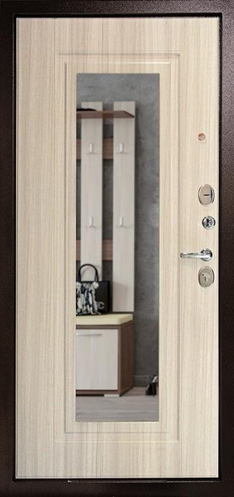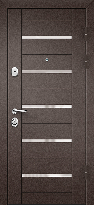 Прочный стальной каркас, лист металла толщиной 2 мм и система блокираторов делают эту модель надежным барьером для квартиры, офиса или частного дома. Внешняя поверхность покрыта молотковым напылением, устойчивым к механическим повреждениям и перепадам температуры, благодаря чему дверь сохраняет аккуратный вид долгие годы. Внутренняя накладка МДФ добавляет уюта и гармонично сочетается с интерьером прихожей. Зеркало на полотне выполняет не только декоративную функцию, но и делает пространство визуально шире. Зеленая входная дверь в квартиру №2 комплектуется двумя замками российских производителей — сувальдным Просам и цилиндровым Мосрентген, каждый из которых оснащён тремя ригелями. Два контура резинового уплотнения помогают минимизировать сквозняки и шум, а возможность выбрать сторону и тип открывания делает установку максимально удобной. При необходимости отделку, замки и дополнительные элементы можно адаптировать под индивидуальные требования. Зеленая входная дверь в квартиру №2 от производителя: быстрое изготовление и монтаж в Туле, индивидуальные размеры, широкий выбор материалов и фурнитуры, официальная гарантия до 10 лет.